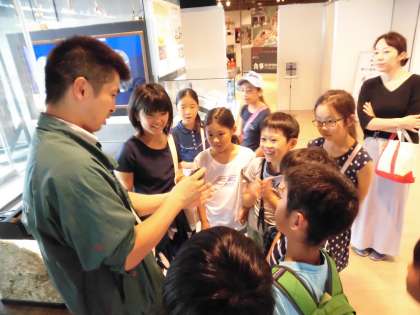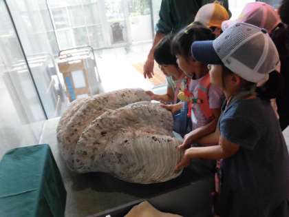博物館では、オオシャコガイという世界で一番大きな200kgにもなる貝を触ったり、大きな魚が小さい魚を食べる「食物連鎖」を見せていただいたり、バニラアイスクリームのバニラの種を手に取ってにおいを体感したりするなど、動物から植物まで盛りだくさんの講座となりました。子ども達は、生き物の生態やその不思議さに「お〜」と感激の声をあげ、とても楽しい1日となりました。