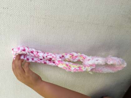 細く編んだ毛糸を輪にして長くつなげればマフラーのできあがり。