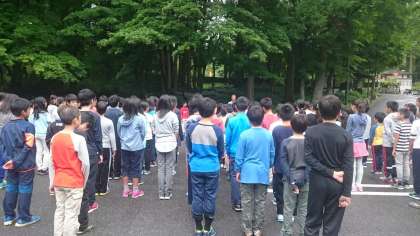 2日目スタートです!天気が心配されましたが、ちょうど雨が上がって外で朝の会ができました。