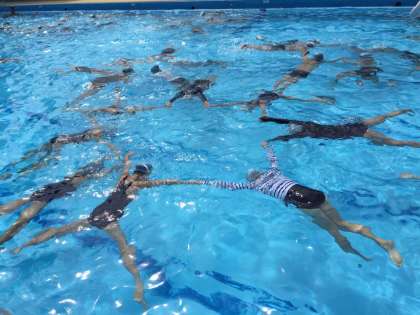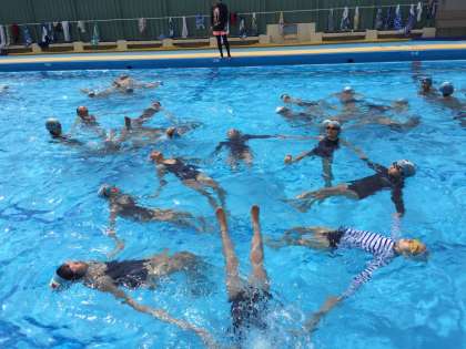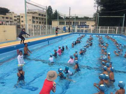 水中で息を吐きながらもぐったり、体の力を抜いてフワッと浮いたりすることは泳ぐ上で大切なことです。クラスや学年を越えて、かかわりながら活動できるのも、夏休みの水泳ならではです。低学年では、人気の音楽に合わせて楽しく行っています。高学年では、手と手と手を取り合い浮くことができました。
