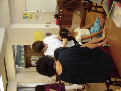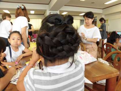 まず、基本の編み込みを教えていただき、その後、編み込みを使ったアレンジや、髪の毛でリボンをつくる方法等を教えていただきました。浴衣に似合いそうなヘアアレンジで、みんなとてもかわいい髪形になりました。色々な質問にも対応していただき、日頃使えそうなコツも教えていただきました。