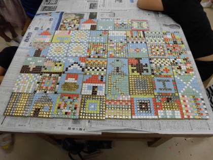 午前中にスマイルスクールで1・2・3年生がタイルなべしき作りをしました。リクシルさんの協力により材料の準備や作り方を教えていただくことができました。真剣な表情でタイルを並べたり、貼り付けたりして自分なりの作品を楽しみながら仕上げることができました。