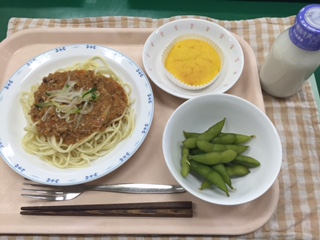 9/6 本日の給食 公開日 2016/09/07 更新日 2016/09/07 給食 〜今日の献立〜 ジャージャー麺 牛乳 枝豆 かぼちゃのケーキ 〜給食メモ〜 今日は、「枝豆」のクイズを出したいと思います。枝豆は、成長すると名前がかわります。何という名前になるでしょうか? 1.そら豆 2.小豆 3.大豆 ※クイズのこたえは、「食材がとれたところ…」の最後にのせています。 食材がとれたところ・・・ 閉じる 豚肉…静岡県 鶏卵…岩手県 にんにく…青森県 しょうが…高知県 たまねぎ…北海道 にんじん…北海道 もやし…群馬県 きゅうり…長野県 えだまめ…群馬県 かぼちゃ…北海道 クイズのこたえは、3の「大豆」です。成長すると、名前がかわるだけでなく、栄養素もかわります。枝豆にはビタミン、大豆にはたんぱく質がたくさん入っています。食べものには、それぞれよいところがあります。すききらいせず、残さず食べましょう。