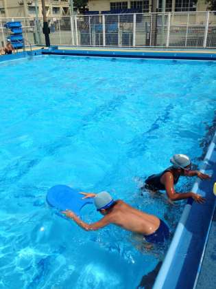 最後はクラス対抗ビート板リレーを行いました。プールの横10メートルを使ってバタ足だけで対岸まで泳ぎます。結果は2組が差をつけて一位になりました。