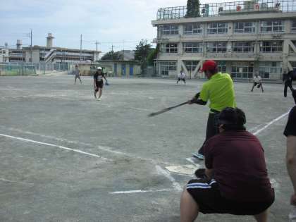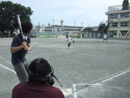 学校公開のあとはおや児の会との親睦会です。毎年、天候に恵まれソフトボールができていたのですが、今年はちょっと心配をしていました。しかし、天候は私たちの味方をしてくれました。毎年恒例のソフトボール大会を十分に楽しむことができました。もちろん始球式は私内藤が務めさせていただきました。珍プレー、好プレー続出で大いに盛り上がりました。
