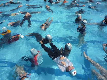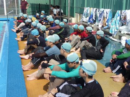 毎年6年生は着衣の水泳を体験します。今年は、着衣のままで、クロール、平泳ぎ、速く、ゆっくりなどの体験をしました。『先生、すごく重いです』『平泳ぎをゆっくり泳ぐと少し楽みたい・・・』など、さまざまな感想が出てきました。