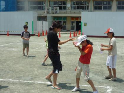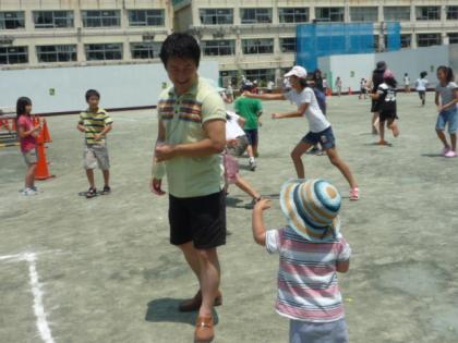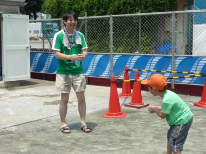 今日のふれあい広場のイベントは、恒例の水風船!いっぱいにふくらんだ水風船で、遊びます。先生、お父さん、お母さん、そして友達、誰に当てたっていいのです。もちろん私(校長)もずぶぬれですが、用意周到なことに私たちは下に水着を着ているのです。