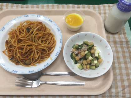 毎月19日は、食育の日です。今月は19日がお休みだったので、今日の給食を食育の日の献立にしました。食育の日には、「給食で世界を飛び回ろう!〜東京オリンピック・パラリンピックに向けて、世界各国の料理に触れよう〜」ということで、いろいろな国の料理を出しています。そこでクイズです。今日の献立は、どこの国の料理でしょうか?