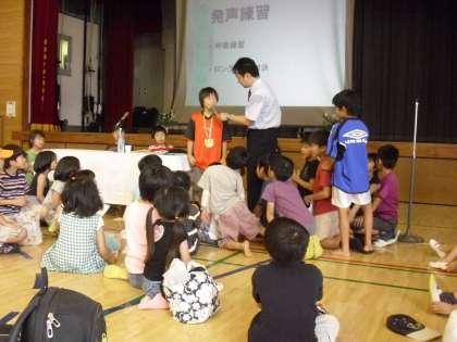 今日は、話し方のコツ、緊張した時はどうしたらよいのか?などのお話と、アナウンサーが実際に練習している呼吸法や、ロングトーン対決(声を何秒間出せるか、優勝者は32秒でした)、そして発声練習(あえいうえおあお、きゃききゅきぇきょ)など基本的な練習をしました。さらには応用編ということで、難読名称や本物のニュース原稿まで読ませていただきました。