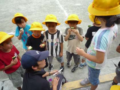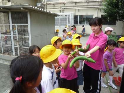 6/28 きゅうーり採り隊1年生 公開日 2010/06/28 更新日 2010/06/28 校長室より 今週から、校舎の壁面緑化に植えているキュウリを1年生の子どもたちから順番に収穫することにしました。名付けて『 きゅうーり採り隊』です。1班に一本くらいあるとみんなで少しずつ食べられます。 収穫して、きれいに洗って食べている嬉しそうな1年生の顔を見ているのが、また嬉しいのです! あしたは1年生の3・4組です。2年生はその次ですよ!お楽しみに!