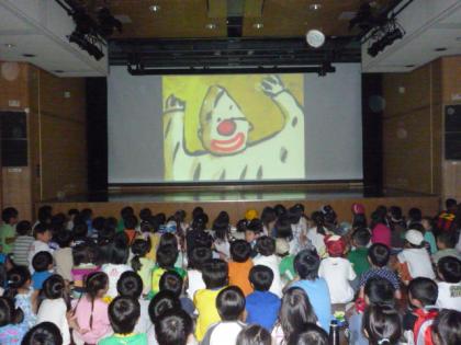 今日は7月11日の休み時間に入場券を配った映画会当日です。午前中は低学年向き、午後は高学年向きの映画が上映されました。挨拶は主催者を代表して、午前は飯田恭次さん午後は江藤眞理子さんがしてくださいました。