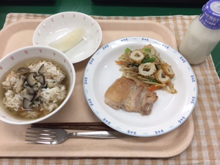 今日の献立の「きのこ茶漬け」は、5年生が和食の良さを生かして考えてくれた料理です。5年生から用賀小学校のみなさんに和食の良さを紹介してもらいたいと思います。