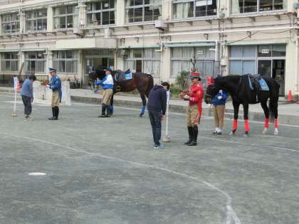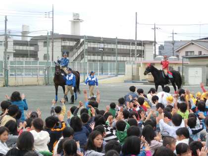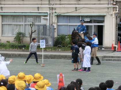 今日の集会には「颯駿号」と「青葉号」の2頭が来てくれました。集会委員会の進行のもと、子どもたちはお馬さんとふれあいながら、毎日の見守りに感謝の気持ちを表しました。また、警察の方にも安全に気をつけて登校するようにとお話をしていただきました。