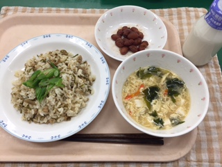 今日は、今が旬の「ごぼう」を使って、鶏ごぼうごはんを作りました。そこで今日は、「ごぼう」のクイズを出したいと思います。ごぼうには、おなかの中をきれいにしてくれる栄養素がたくさん入っています。さて、その栄養素とは、次のうちのどれでしょうか?