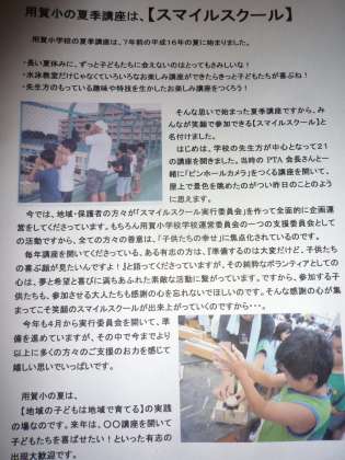 用賀小学校のスマイルスクールは、今年で7回目を迎えます。はじめは、先生方が中心になって楽しい夏季講座をしようと開設したものですが、今では保護者・地域の方々が実行委員会を作って企画運営をしてくださっています。もちろん、教師も一緒に参加しますが、多くのご支援に感謝しております。