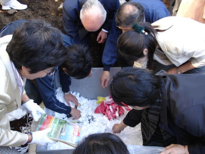 いよいよタイムカプセルが開封されましたが、状態がとても良く、内容物も当時のままといっていいほどでした。中身はクラス毎に袋に分けて保存されていて、学年組を呼ばれたら当時のクラスメイトが受け取りに行きました。自分の作品を見つけて歓声を上げる人がたくさんいて、皆さんとてもなつかしそうでした。おもしろい物に、当時の給食の食器や、お酒も入っていました。お酒はきっと20年物(ウイスキー)をみんなで飲もうという約束で埋めたのでしょうね。