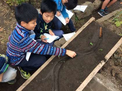 川の両側に旗をおくことで、土地の作りの変化がわかりやすくなりました。「やっぱりここがけずれた!」「カーブの外側は屋根のような形になったよ!」と声が挙がりました。そして最後に、「本物の川も、こうやってけずれていくのかな。」という疑問があがり、今後の学習への見通しをもつことができました。