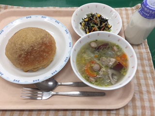 今日のポトフは、和風だしを使った「季節の和風ポトフ」です。そこで今日は、「だし」のクイズを出そうと思います。給食では、料理によってだしを使い分けています。今日のポトフに使っただしは、何からとったでしょうか?