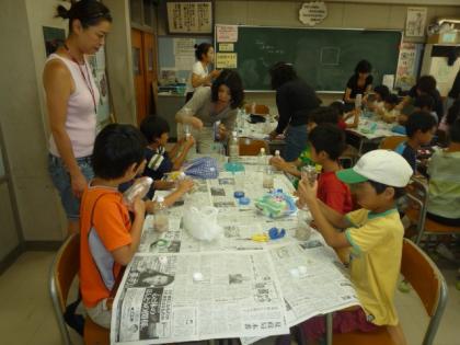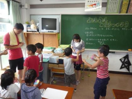 今日は、「砂時計作り」「ぶんぶんゴマ」「英語で遊ぼう」
