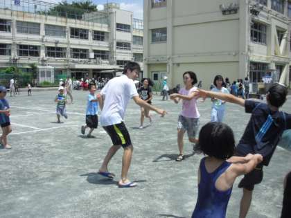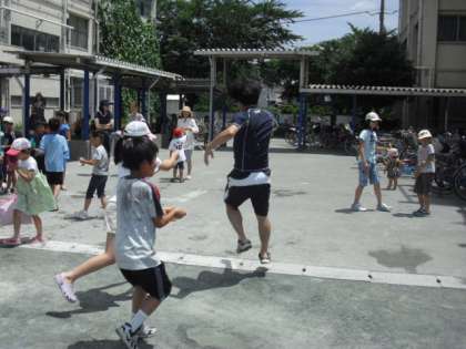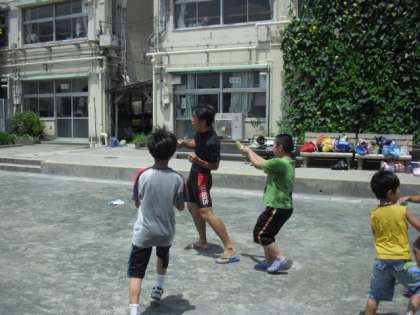 子どもたちの水攻めにたじたじの原島先生、重田先生、そして校長の私も、水の冷たさに思わず跳び上がってしまいました。