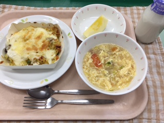 ドリアに使っている牛乳やチーズには、骨や歯を丈夫にしてくれるカルシウムがたくさん入っています。残さず食べましょう。