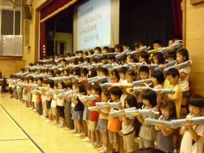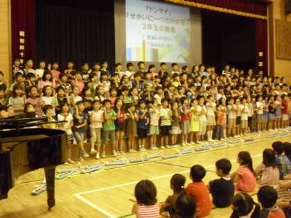 7/14 音楽集会 3年生の発表その1 公開日 2010/07/14 更新日 2010/07/14 校長室より 今日の音楽集会は3年生の発表です。「ドンマイ」の合唱と「せかいに一つだけの花」の鍵盤ハーモニカでの演奏がありました。「ドンマイ」は振り付けをしながら、とてもかわいらしく楽しそうに歌っていました。「せかいに一つだけの花」は最後にもう一度、全校児童で歌いました。体育館が割れんばかりの大きな声と手拍子では大いに盛り上がりました。3年生の先生方もタンバリンで参加していました。