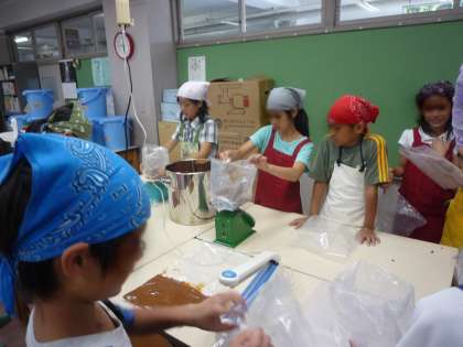 この味噌は、4年生の2月25日に農大へ行って味噌を仕込んでから4カ月半寝かしておいたものです。仕込んだときは薄茶色だった味噌の色が、赤っぽい茶色に変わって熟成した味噌の香りがしています。
