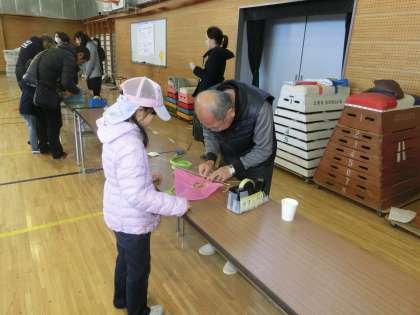 本日のふれあい広場は、「凧作り」でした。金子勝治さんを講師にお招きし、凧作りをしました。凧には、自分の好きなイラストを描きました。