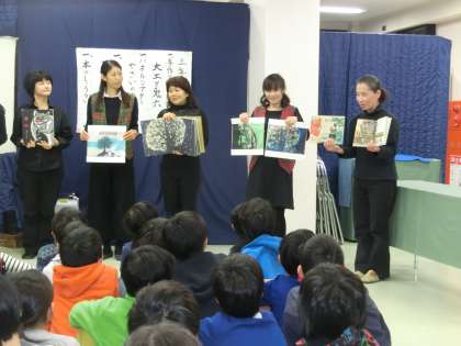 お話会は、手作り工作紙芝居「大工と鬼六」、パネルシアター「やさいのおもさ」、OHP劇「モチモチの木」の三本立てでした。子どもたちは紙芝居を真剣な目で見つめ、お話の世界に引き込めれていました。