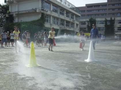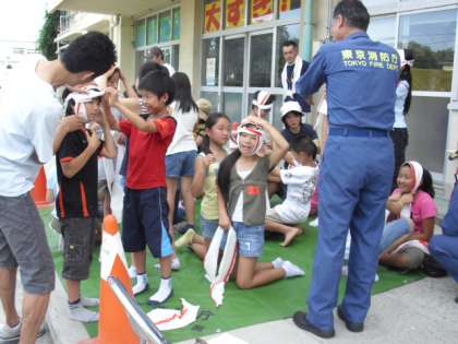 開会式の後は、消火器訓練、煙体験、三角巾の使い方などの体験学習と、防災倉庫や仮説トイレ、消防車の見学をしました。