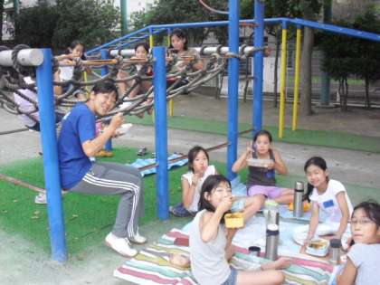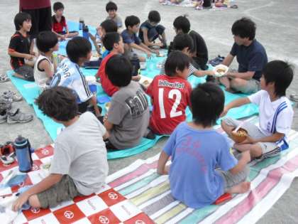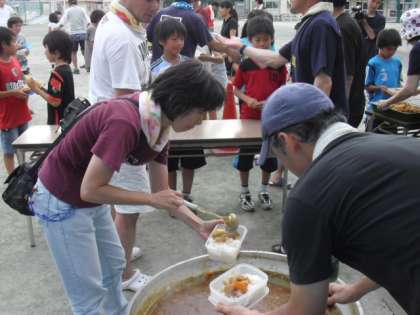 夕食はもちろんカレーライスです。ご飯は、飯盒で炊いたご飯と、役所からいただいたアルファ米です。おやじの会の方々とPTAのお手伝いの方々の愛情たっぷりの、おいしいカレーライスをお腹いっぱいいただきました。