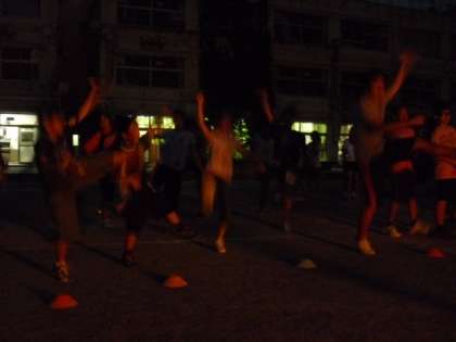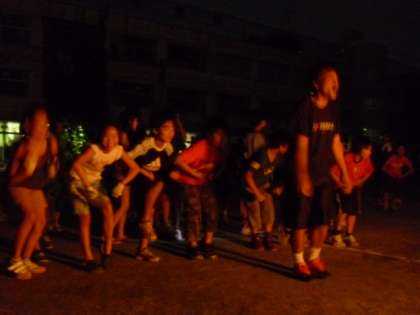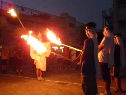 夕食の後はキャンプファイヤーです。まず火の神が登場し、友情の火、全力の火、感謝の火をいただきました。次に「ジンギスカン」「猛獣狩りに行こう」「マイムマイム」などをみんなでおもいっきり楽しく踊り、キャンプファイヤーは大いに盛り上がりました。