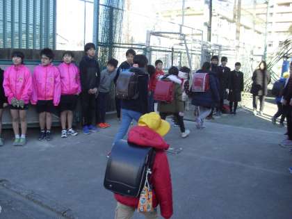 今朝も学校の正門と南門に用賀中の中学生が来てくれて、小学生といっしょにあいさつ運動をしました。中学生がいっしょということもあり、普段よりも元気のいいあいさつの声がたくさん聞かれ、活気にあふれていました。子どもたちの力でとても気持ちのよい朝となりました。