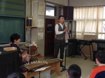 本日の4年生の音楽は、日本の伝統的な楽器であるお箏と尺八の演奏家の先生を招いた授業を行いました。