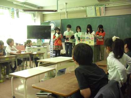 子どもたちに野菜の栄養のことを詳しく教えてくれました。ベジレンジャーは農大の学生さんです。大学生のお兄さん、お姉さんは子どもたちにはとっても親しみやすく、楽しく学習ができました。今日の学習が子どもたちの食生活につながるとうれしいです。