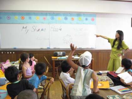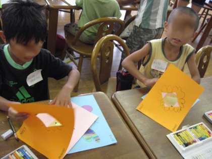 7/26 スマイルスクール英語で絵本をつくろう! 公開日 2010/07/26 更新日 2010/07/26 特色ある活動・取り組み 今日の低学年のスマイルスクールは「英語で絵本をつくろう」です。 午前中からたくさんの子どもたちがランチルームへ来ました。 画用紙の中心をいろいろな形にくりぬき、 その穴を動物や虫に見たてて、絵を描きます。 カラフルな色のすてきな絵本ができあがりました! まる、しかく、さんかく、たまごがた、 それぞれ英語で何て言うのか、みんなわかったかな?