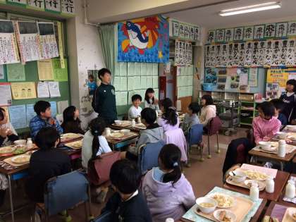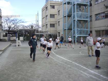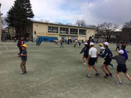 今日は、農大駅伝部の学生8名が5年生と一緒に過ごしてくれました。給食を食べ、昼休みには各クラスのクラス遊びに参加していただき、おにごっこやSけんを楽しみました。