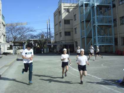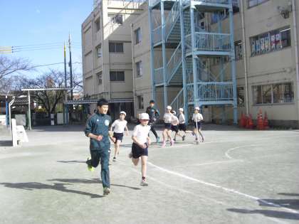 楽しい給食と休み時間を過ごした後、5時間目はクラスに分かれウォーミングアップをして1kmを計測しました。