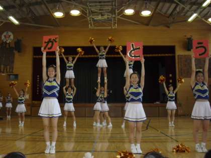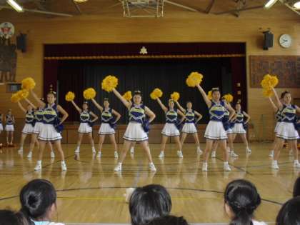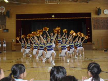 本物のチアリ−ディングも見せてもらいました。さすが、決めのポーズもバッチリ決まってます。あいさつや返事の仕方など、とても礼儀正しいチアリーディング部の皆さん、ありがとうございました。