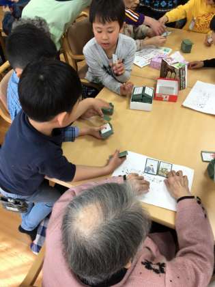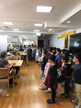 今日は1年1組の子どもたちが、用賀小学校の近くの「ふきのとうデイホーム」をご利用のみなさんと交流をさせてもらいました。司会や代表の言葉を言う役の子は何度も練習し、しっかりと発表することができました。ビリーブの曲もきれいな声で心を込めて歌いました。一緒に「おはじき」「ぼうずめくり」「折り紙」をして楽しい時間を過ごしました。ふきのとうのみなさんもとても喜んで下さいました。あっと言う間の45分でしたが、たくさんの経験ができたと思います。