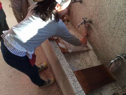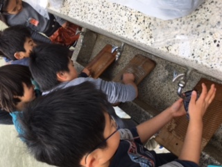 3年生は社会の『昔のくらし』の学習として、洗濯板を使って靴下の洗濯に挑戦しました。