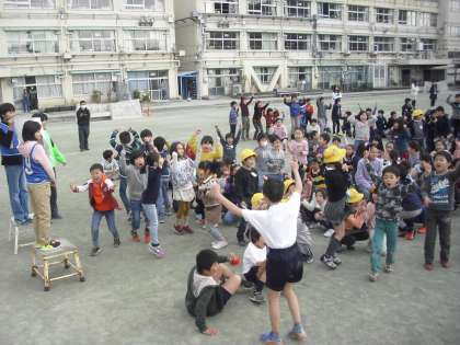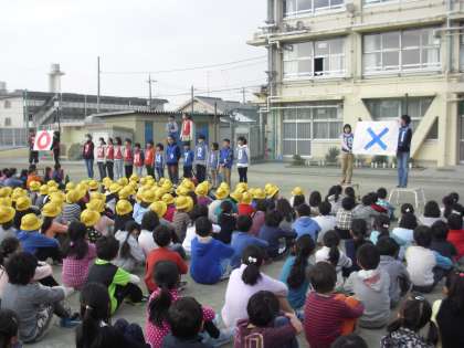 今日のゲーム集会は「学年別○×クイズ」です。「1年生が一番好きな給食はカレーライスか」「6年生が一番好きな行事はもちつきか」というように全学年に関する問題が出題されました。