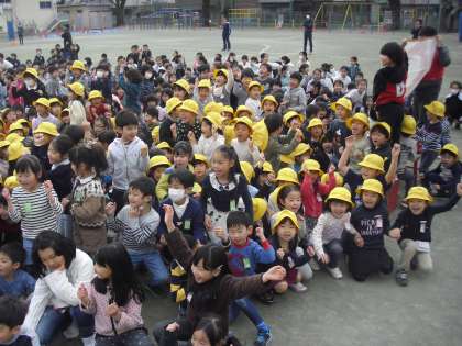 800人近い子どもたちが○か×のコーナーに移動して正解を待ちます。ちなみに1年生の一番好きな給食はカレーですが、6年生の一番好きな行事は運動会です。時には少数グループが正解になることもあり、全校でクイズを楽しむことができました。