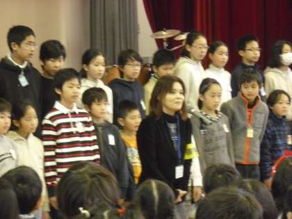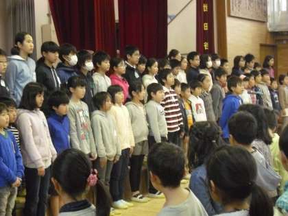 子供会の班旗引継式を行いました。用賀小学校では子どもたちの安全を地域で見守るために保護者の皆様のご協力のもと、地域ごとに子供会を作っています。今日は今年度の班長から来年度の班長に班旗を引き継ぐセレモニーを行いました。