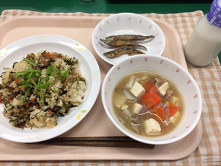 3/7 本日の給食 公開日 2017/03/07 更新日 2017/03/07 給食 〜今日の献立〜 磯おこわ 牛乳 きびなごのからあげ 豚汁 〜給食メモ〜 今日は、「きびなご」のクイズを出したいと思います。「きびなご」は、きびなごの様子をあらわす鹿児島県の方言から名前がつけられたと言われています。さて、きびなごの「きび」は鹿児島県の方言で、何という意味でしょうか? 1.細い 2.銀色 3.帯 ※クイズのこたえは、「食材がとれたところ…」の最後にのせています。 食材がとれたところ・・・ 閉じる 米…埼玉県 鶏肉…岩手県 豚肉…茨城県 きびなご…鹿児島県 にんじん…千葉県 さやえんどう…愛知県 ごぼう…青森県 だいこん…神奈川県 さといも…埼玉県 長ねぎ…千葉県 クイズのこたえは、3の「帯」です。きびは「帯」、なごは「小さい魚」という意味で、帯のようなもようのある小さい魚なので、「きびなご」と名前がつけられたそうです。