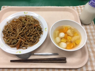 今日の給食は、「ソース焼きそば」です。給食の焼きそばは、野菜をたくさん使っていて栄養満点です。そこで今日は、「野菜」のクイズを出したいと思います。野菜は、1日にどれくらい食べるとよいと言われているでしょうか?