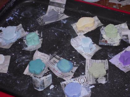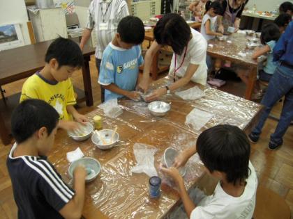 まず、はじめに常設展「チルドレンズミュージアム」を5人一組で、2人の鑑賞リーダーの方がついてくださり、館内をみてまわりました。次に、画材のパステルをつくりました。顔料を水で練って、貝の粉末を混ぜ合わせ、ひたすらこねていきます。形を整えて5分ほどホットプレートで焼いてできあがりです。が、使えるようになるには、3ヶ月から1年ほどかけてゆっくり乾燥させてからです。そうすると画用紙にきれいな色がのるそうです。半年後が楽しみです。楽しい体験ができました。ありがとうございました。