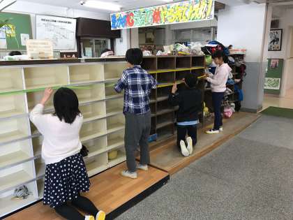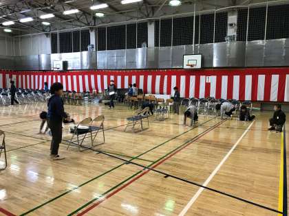 まずは各教室の机やいすの数をあわせるために移動をしたり、教室をきれいにしたりしました。次に入学式準備です。教室のかざり付けや教科書などの配布物をセッティングしました。そして式場準備。卒業式に引き続き、ぞうきんがけやいす並べなどすばらしい働きでした。