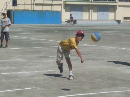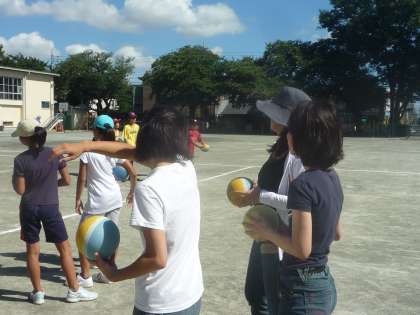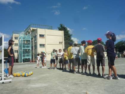 8/4 スマイルスクール・真夏のハンドボーラー 公開日 2010/08/05 更新日 2010/08/05 校長室より まさに真夏のハンドボール教室です。指導する先生も受けている子どもたちも熱い! 真夏の日差しはじりじりと焼けつくようですが、風が強くて心地よいのが救いです。ハンドボールのシュート練習や試合を楽しみましたが、熱射病には十分注意して水分補給と休養をしっかりとっていました。 お母様方も参加していましたが、いち早く休憩! 写真を撮りましたがオフレコです。