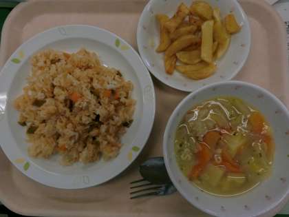 毎月19日は、食育の日です。食育の日には、「給食で世界を飛び回ろう!〜東京オリンピックに向けて、世界各国の料理に触れよう〜」ということで、いろいろな国の料理を出していきます。そこでクイズです。今日の献立は、どこの国の料理でしょうか?